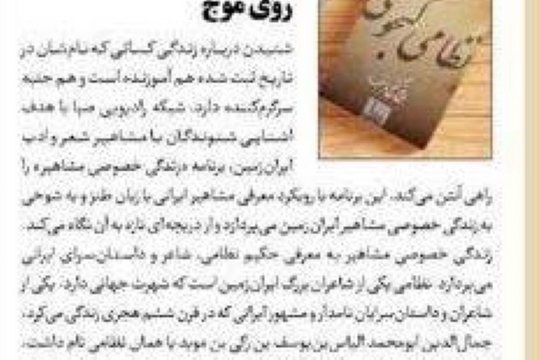 رادیو صبا بزرگداشت نظامی گنجوی را گرامی می دارد رادیو صبا در برنامه «مشتاق دیدار» با روایت داستان هایی از نظامی گنجوی روز بزرگداشت این شاعر و داستانسرای ایرانی را گرامی می دارد. 1 سال پیش